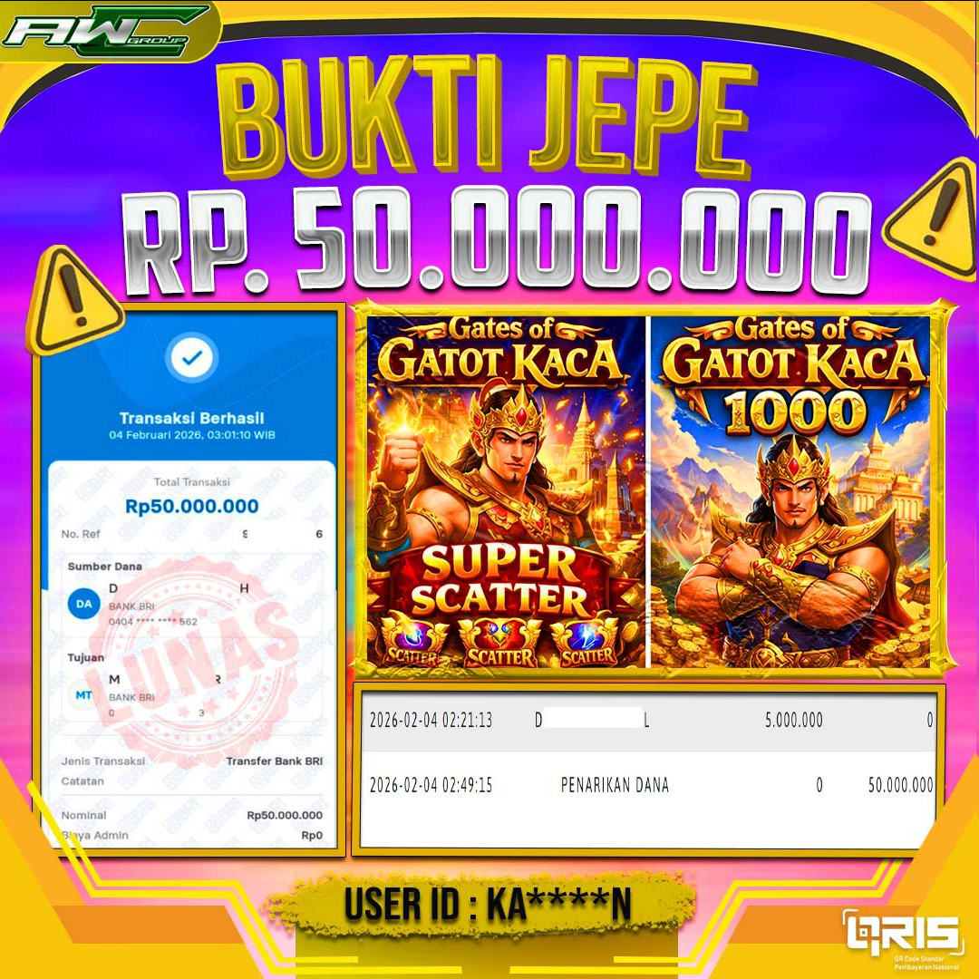 ID : KA*****N JACKPOT PAUS DI SLOT PRAGMATIC PLAY NAMA GAME : GATES OF GATOT KACA SUPER SCATTER & GATES OF GATOT KACA 1000 TOTAL WITHDRAW : 50.000.000